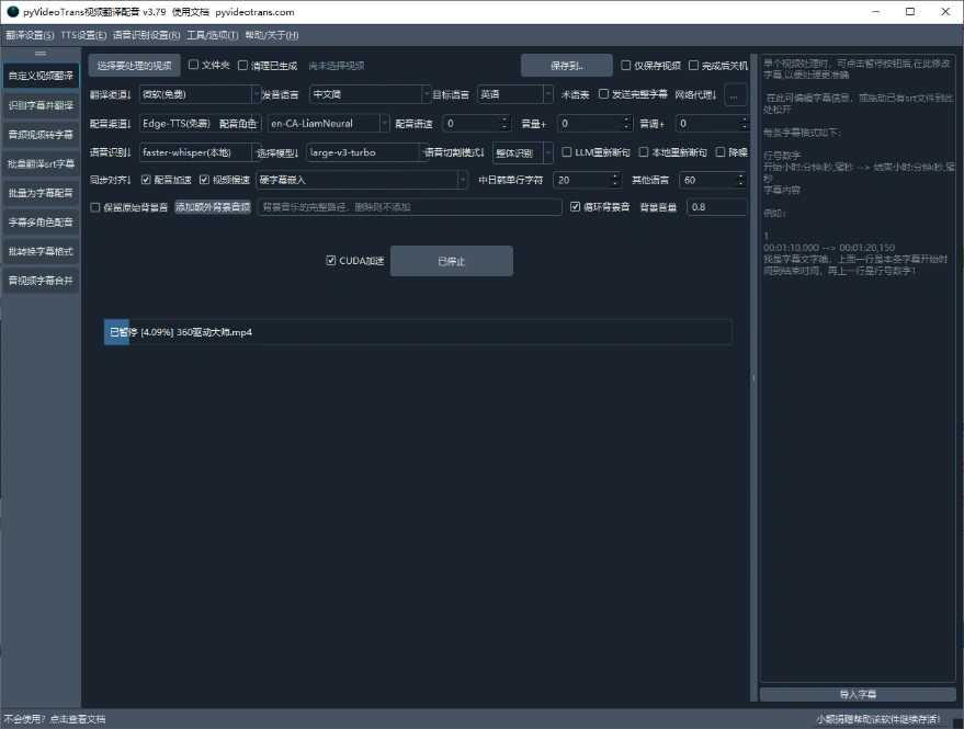 - 文字翻译部分使用 Google 翻译接口,文字合成语音分布则使用 Microsoft Edge tts,背景音乐去除部分用到了 Spleeter。目前,它暂时只支持 Windows 平台。