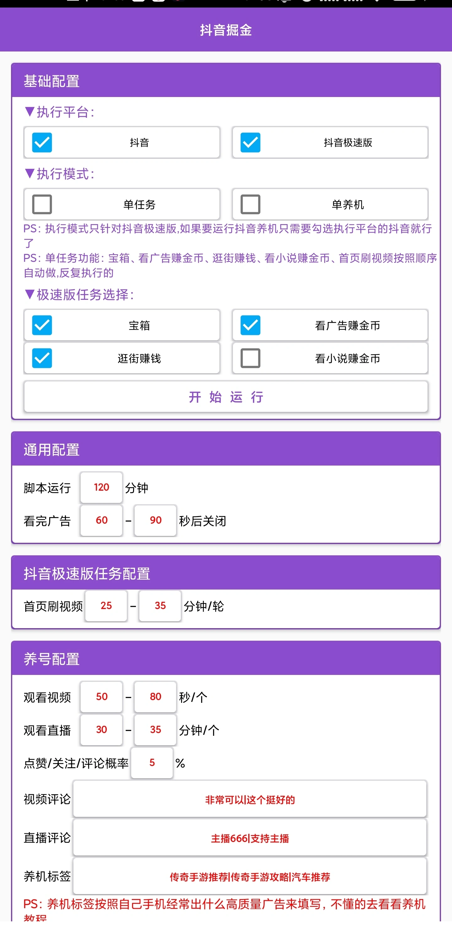 - 通用配置单养机,单任务。养机自由设置。