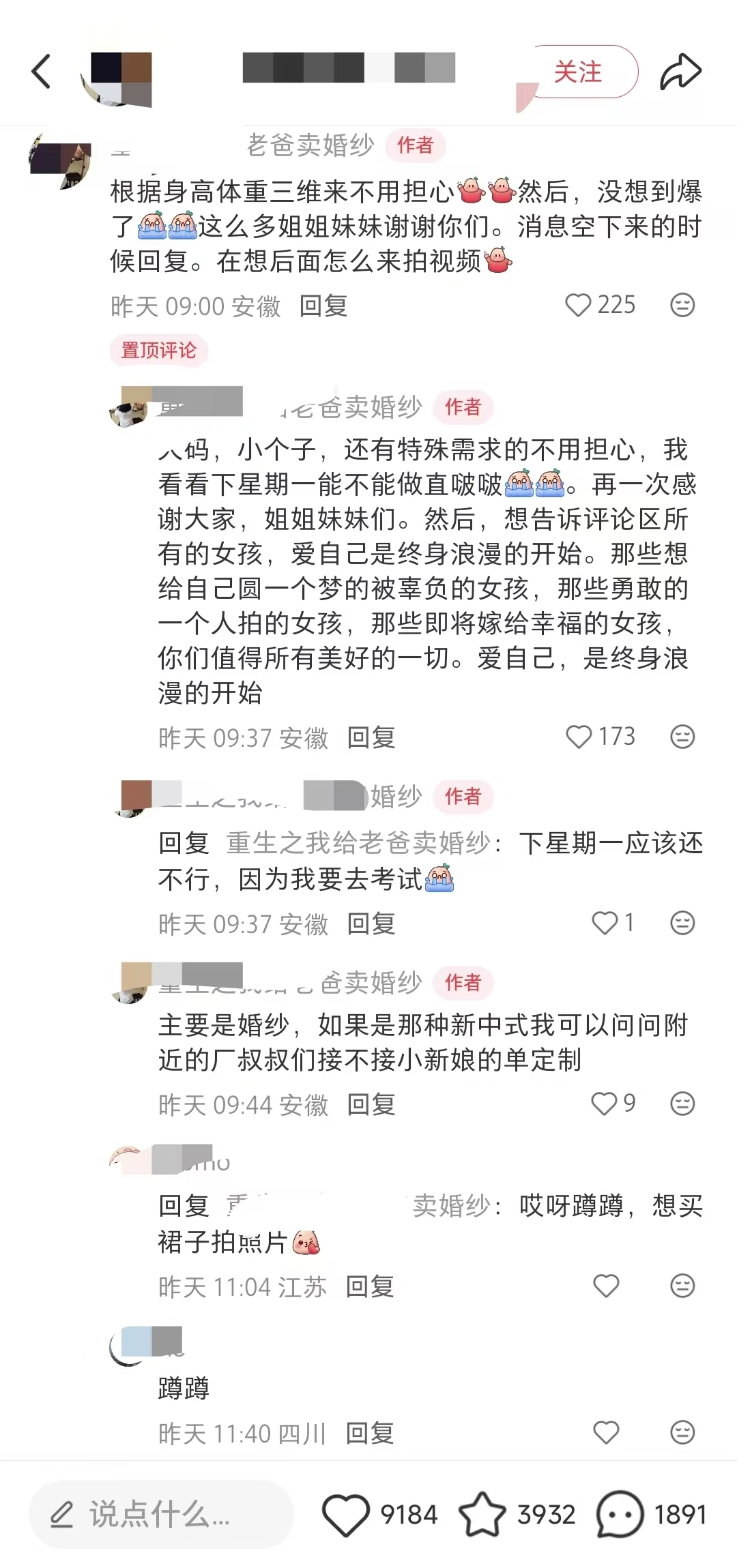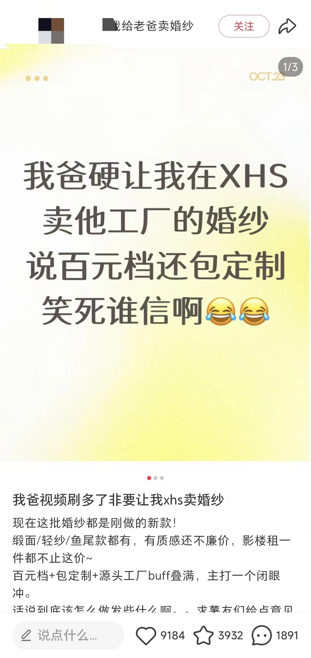 - 我们看下面这个卖婚纱的笔记,我爸硬让我在小红书卖他工厂的婚纱,